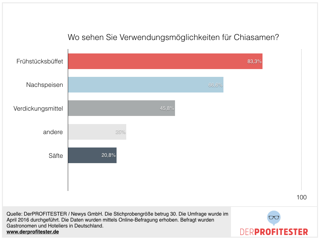 4. Profitester denken beim Einsatz von Chia-Samen als erstes an Frühstück und Süßspeisen, gefolgt von den besonderen Eigenschaften beim Binden von Wasser.