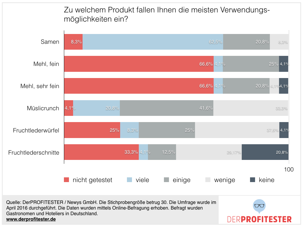 3. Die Einsatzmöglichkeiten von Chia-Samen sind vielfältig und 61% der Befragten fallen viele Verwendungsmöglichkeiten ein. Aber nur wenigen Profitestern fallen Verwendungsmöglichkeiten für Chia-Mehl ein.