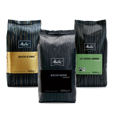 Bacio d'Oro, Bacio Nero und La Tazza Verde nennt Melitta seine Espresso-Sorten. Edel verpackt und fein im Aroma kommen die Bohnen aus Minden daher. Und für all diejenigen, die ein Kännchen Kaffee eines Latte Macchiato vorziehen gibt es natürlich auch Filterkaffee.