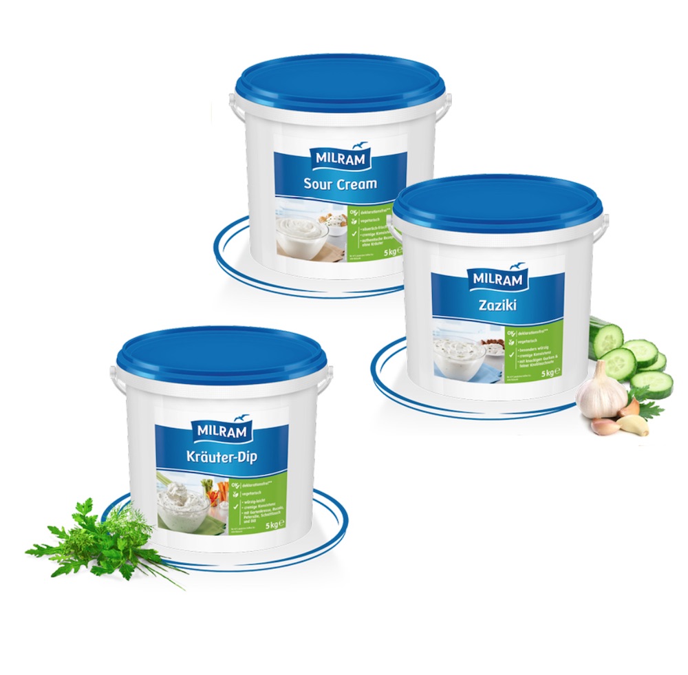 Cremige Dips nach klassischer Rezeptur und servierfertig. Milram hat die Klassiker unter den Dips neu interpretiert und bietet zur Unterstützung der Profi-Küche drei Sorten im Großgebinde: Kräuter-Dip, Sour Cream, Zaziki.