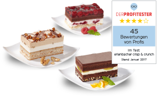 Wer für die eigenen Backkünste nur wenig Zeit hat, der ist mit der „Konditor-Qualität“ von Erlenbacher gut aufgestellt. Unsere Profitester gaben an, dass die Schnitten gut zu lagern und unkompliziert zu servieren sind. Aber nicht nur das einfache Handling und die schnelle Verarbeitung sprechen für die neuen Kompositionen, so die Profimeinung: „Absolut empfehlenswert. Solide Produkte mit modernem Touch, die sowohl optisch als auch geschmacklich überzeugen!“