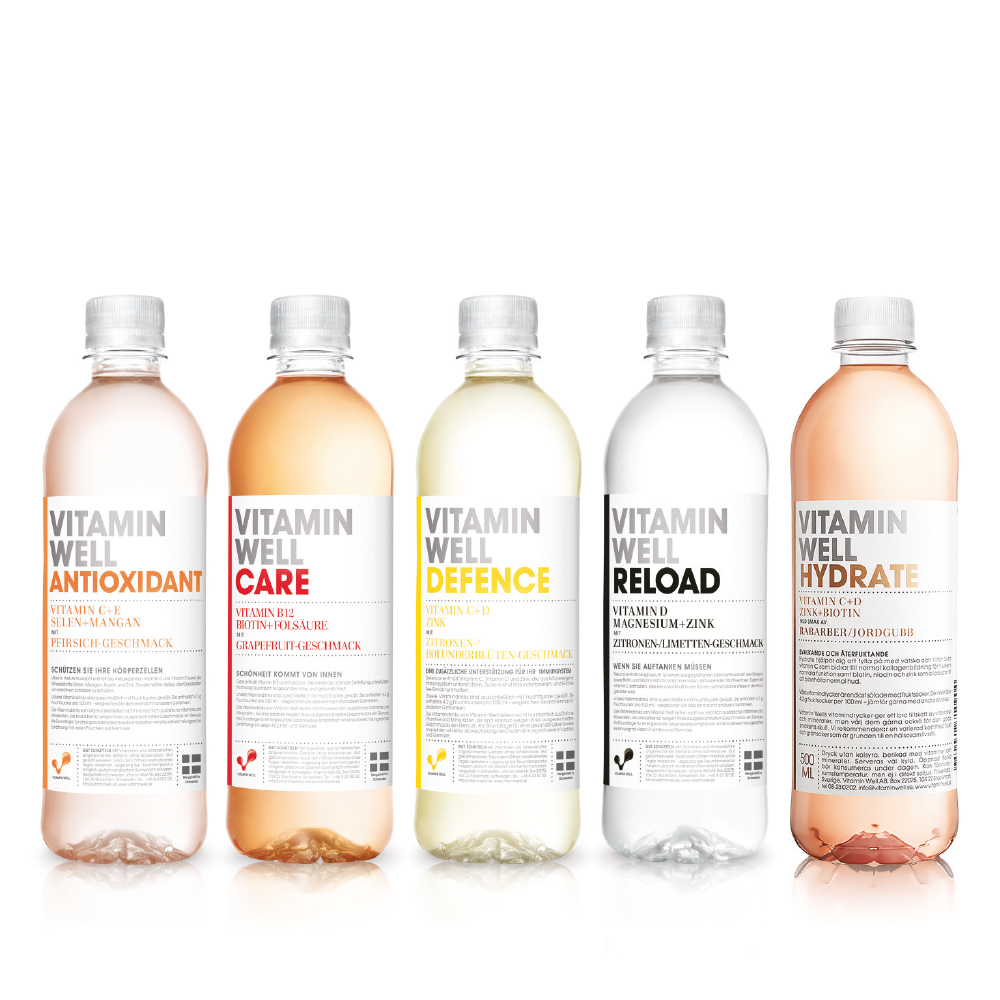 - Vitamin Well Defence enthält u. a. Vitamin C, B12 und Zink. Außerdem enthält der Drink Extrakte von Holunderbeeren und grünem Tee.